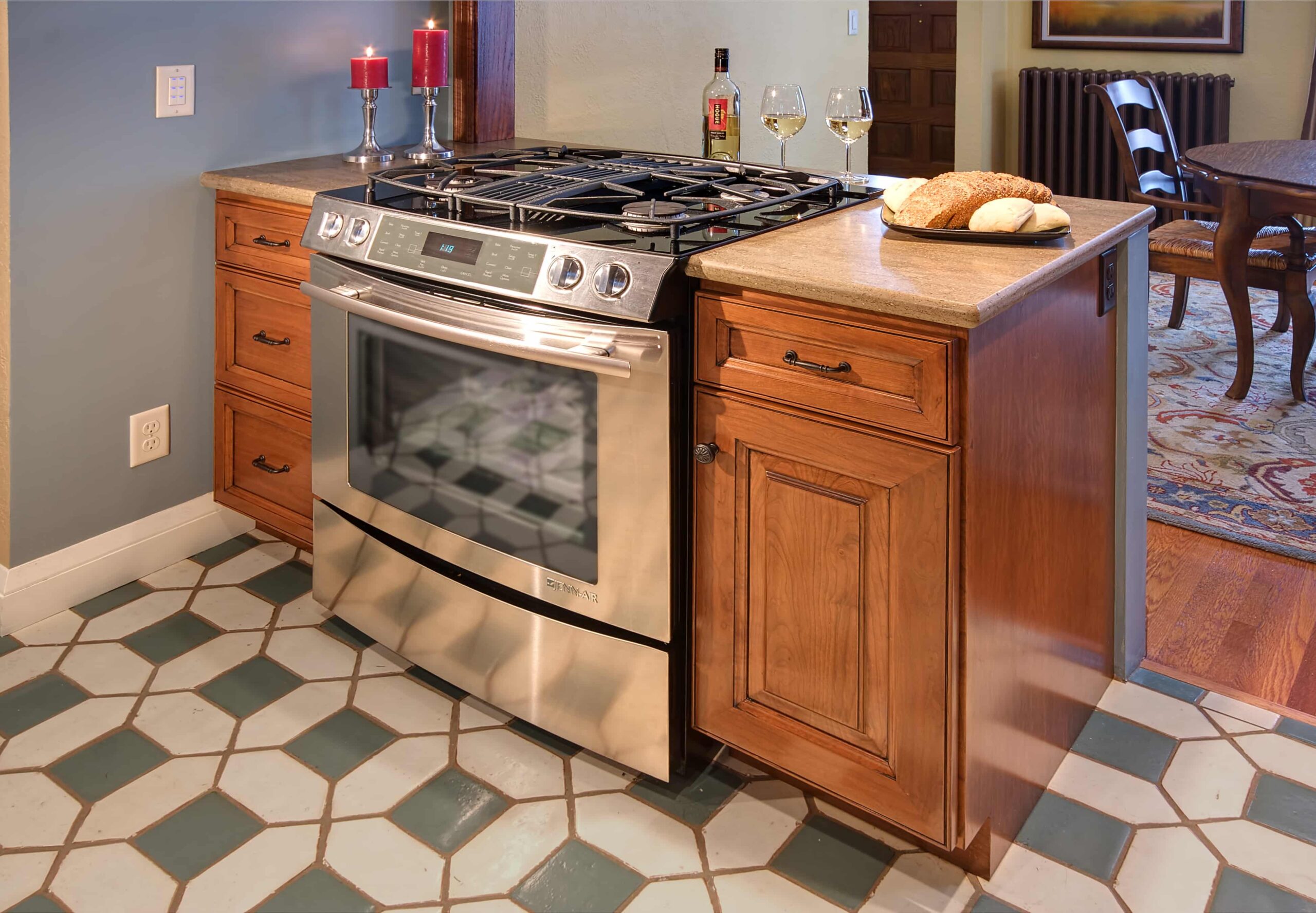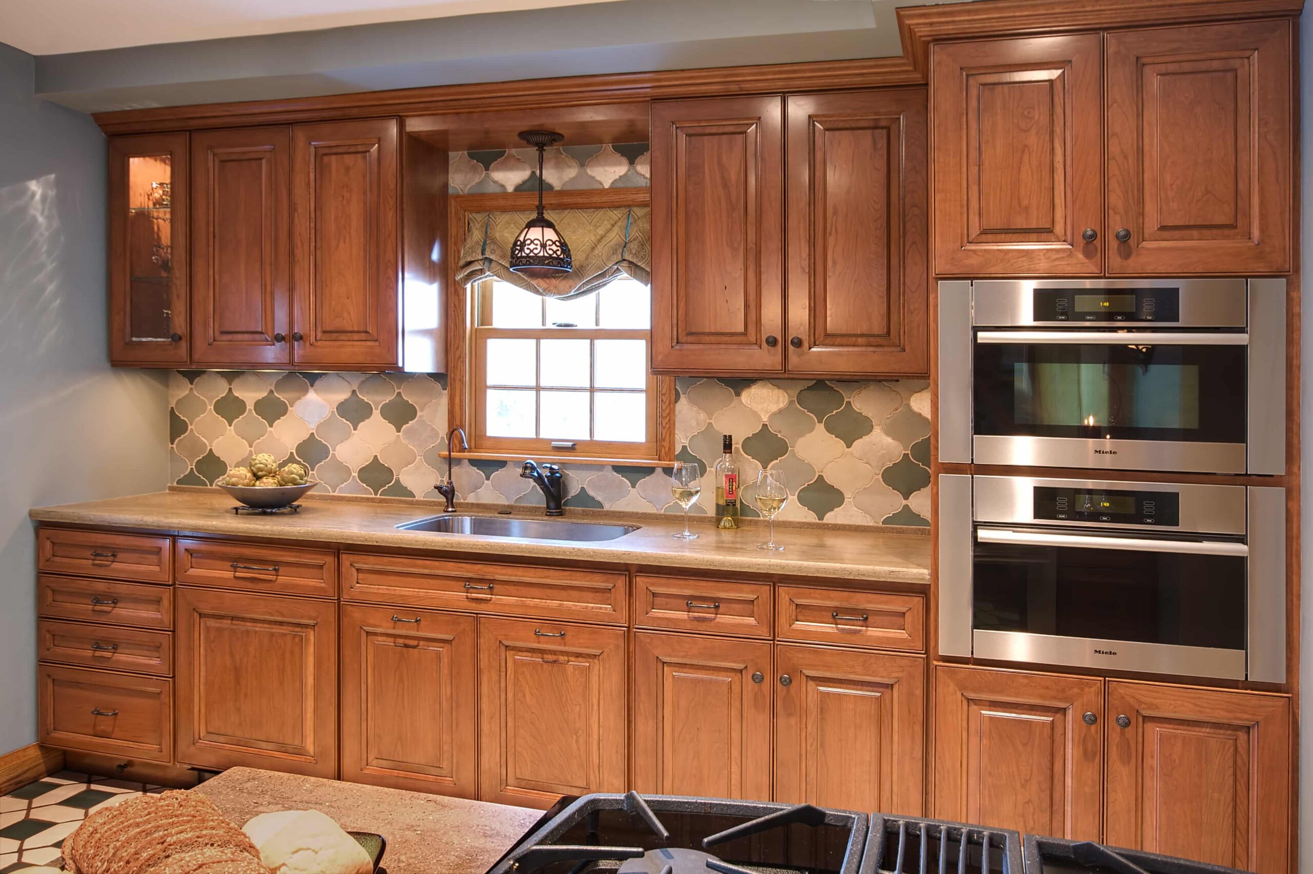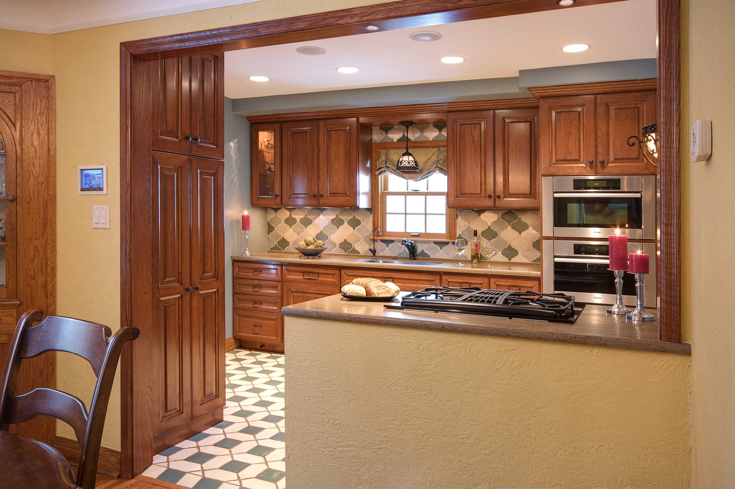 Kitchen: The kitchen was small and closed in, typical of a home built in the 1930’s. There was very limited cabinet space and heat was being provided by radiators. We tackled this phase by opening up the kitchen by building a half wall between the kitchen and dining room, adding a down draft range, in-floor heat, and moving appliances to add cabinetry. Each and every cabinet was well thought out with a purpose for organization and function. Included were amenities such as rollout shelves, elevated mixer shelf, and a narrow pantry cabinet for spice storage. Miele convection & steam ovens were added to promote healthy eating and the lifestyle the homeowners desired. Additional lighting was added with recessed cans, under cabinet lighting, along with a Spanish influence wall sconce and hanging pendant, all controlled by the home integration system that’s remotely located in the lower level to eliminate cluttered light switches in this small space.